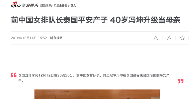 前中国女排队长泰国平安产子 40岁冯坤升级当母亲